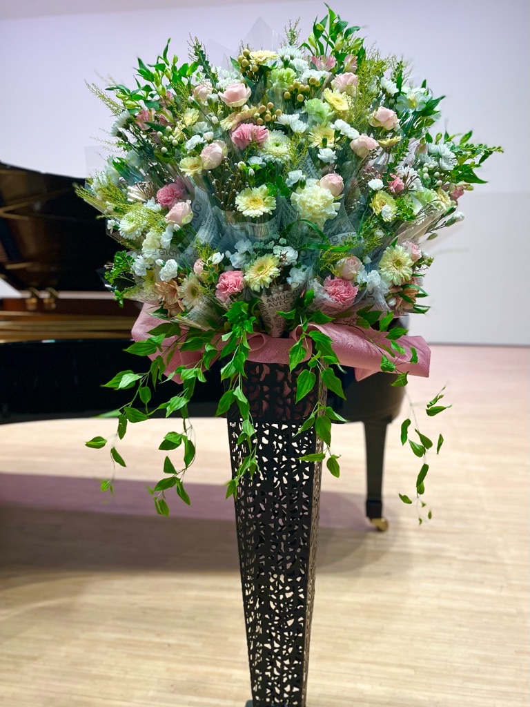 会場装花として使用したお花を、発表会終了後に生徒さんたちが持ち帰りやすいよう、あらかじめ小さな花束にしたものをスタンド花風にした「ブーケスタンド」です。以前もご依頼をいただいている先生からのご要望で、今回はナチュラル系となりました。
